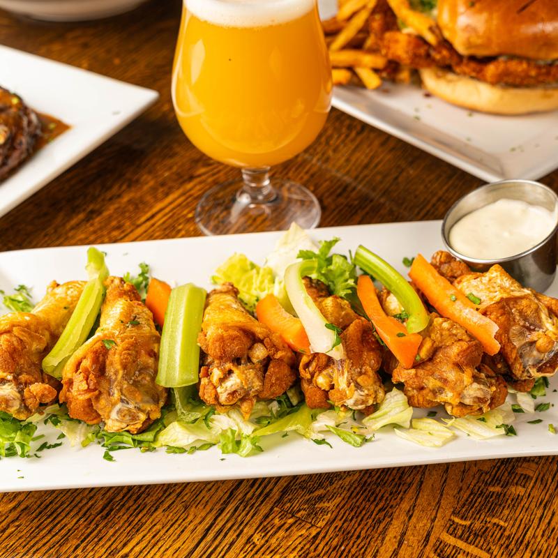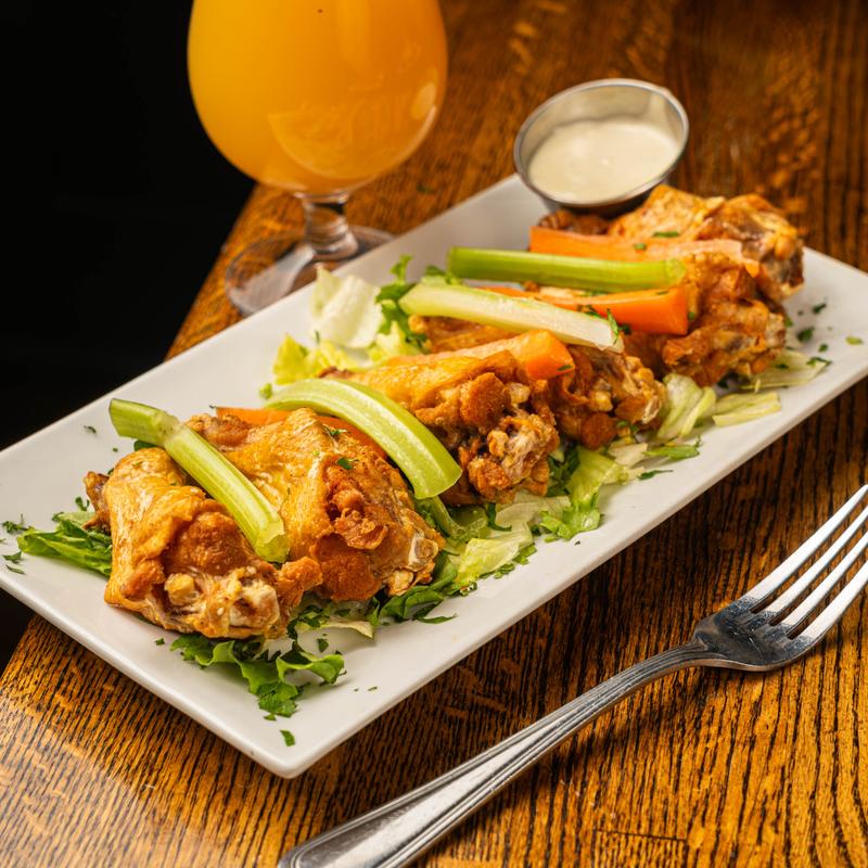 Boneless request | Brined, lightly breaded, vegetable sticks & blue cheese dip • Mild, Med, Hot, Szechuan Soy, Honey Hot Butter, Chipotle BBQ, Cajun Rub